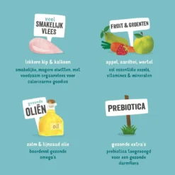 Analyse: ruw eiwit 29 %, ruw vet 17 %, ruwe as 7.5 %, ruwe celstof 5 %, vocht 12 %, calcium 1.3 %, fosfor 1 %, omega-6 vetzuren 2.6 %, omega-3 vetzuren 0.5 %, DHA / EPA 0.1 % / 0.1 %, glucosamine 1200 mg/kg, chondroitine 900 mg/kg